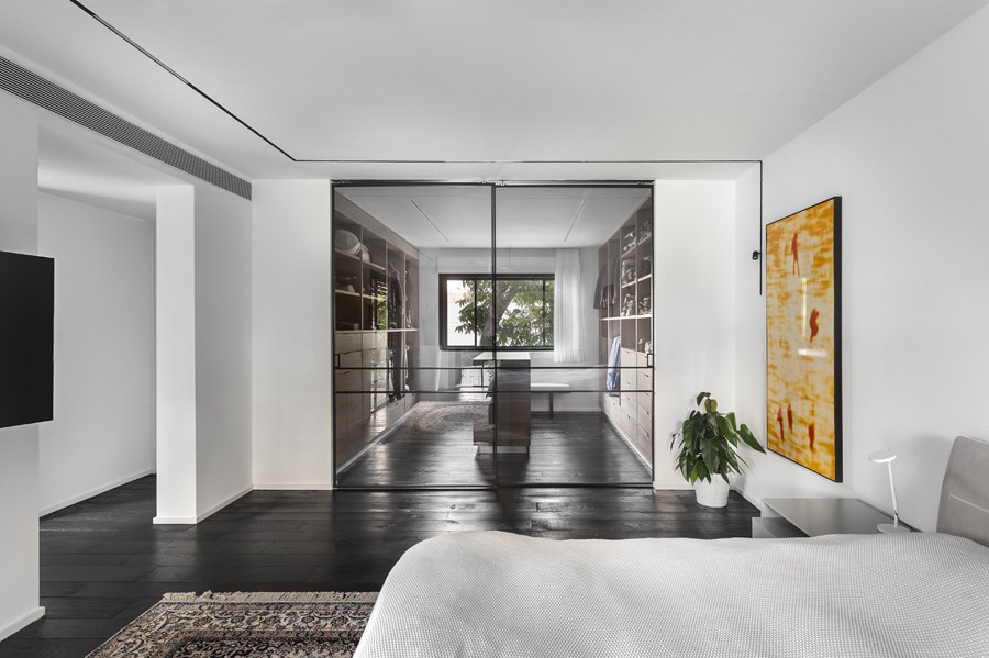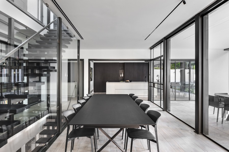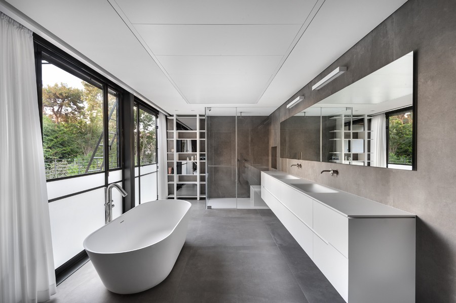 עיצוב מונוכרומטי של שחור, אפור ולבן, מאפיין בית הבנוי בין העצים במרכז הארץ. השפה הכללית מדויקת ורגועה תוך שילוב של אדריכלות מודרנית עם רוך מאופק. החללים פתוחים, מרווחים ומאוזנים ויזואלית, כשנשמר הקשר התמידי בין הפנים לחוץ.