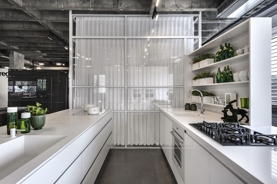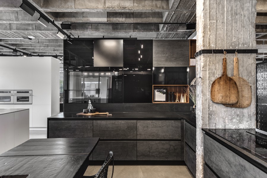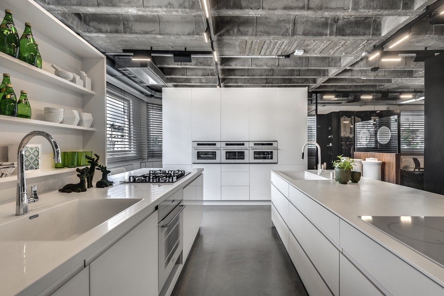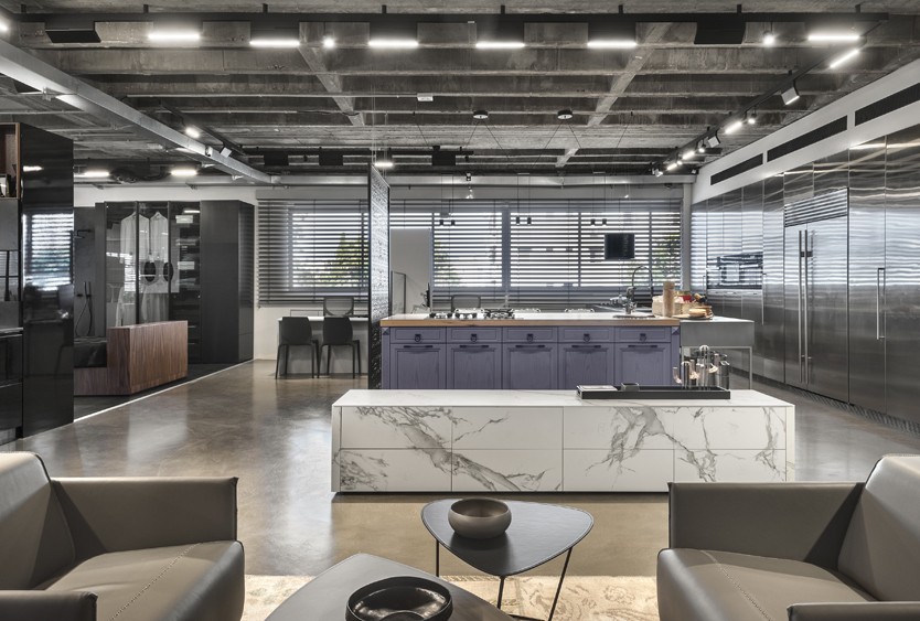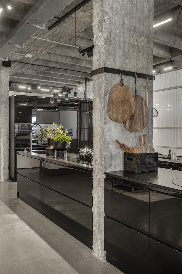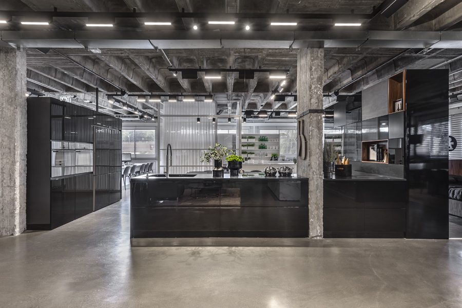 עיצוב הפנים של אולם התצוגה תוכנן בשפה ייחודית שתואמת את המעמד של המותג הוותיק והמבוסס. תקרת הבטון הקיימת הפכה לאלמנט מרכזי, שהציבה אתגר אך גם סיפקה במה אדריכלית דרמטית ובלתי מתפשרת. הפרויקט כלל פיתוח פריטי נגרות ייחודיים בשיתוף עם חברת רגבה, במטרה לייצר חווית תצוגה מבודלת בעולם המטבחים. שילוב מדויק בין אמנות ישראלית למשטחים ומוצרי חשמל של מותגים מובילים, יצר מרחב עשיר, מדויק ורב־שכבתי.