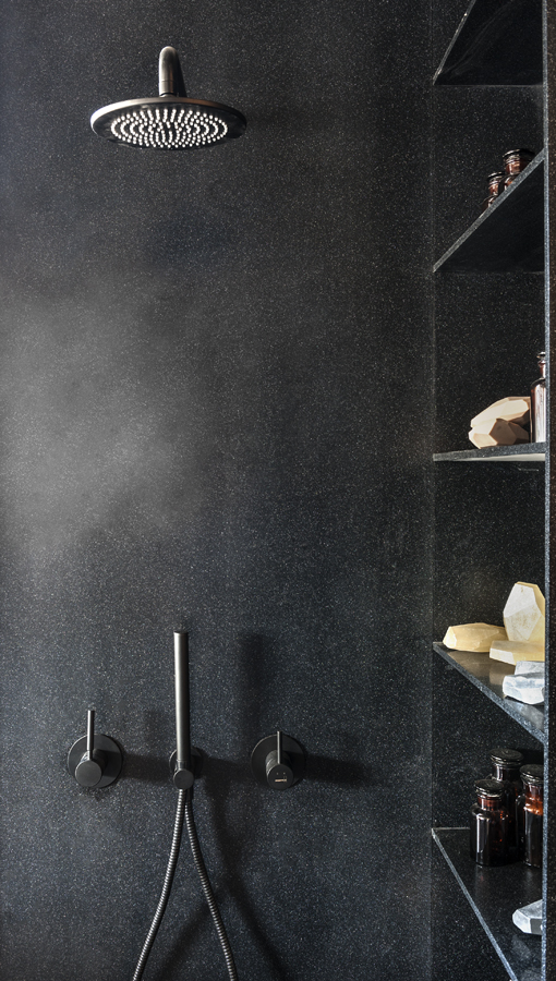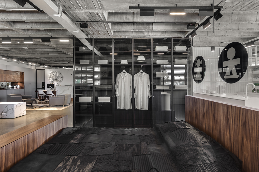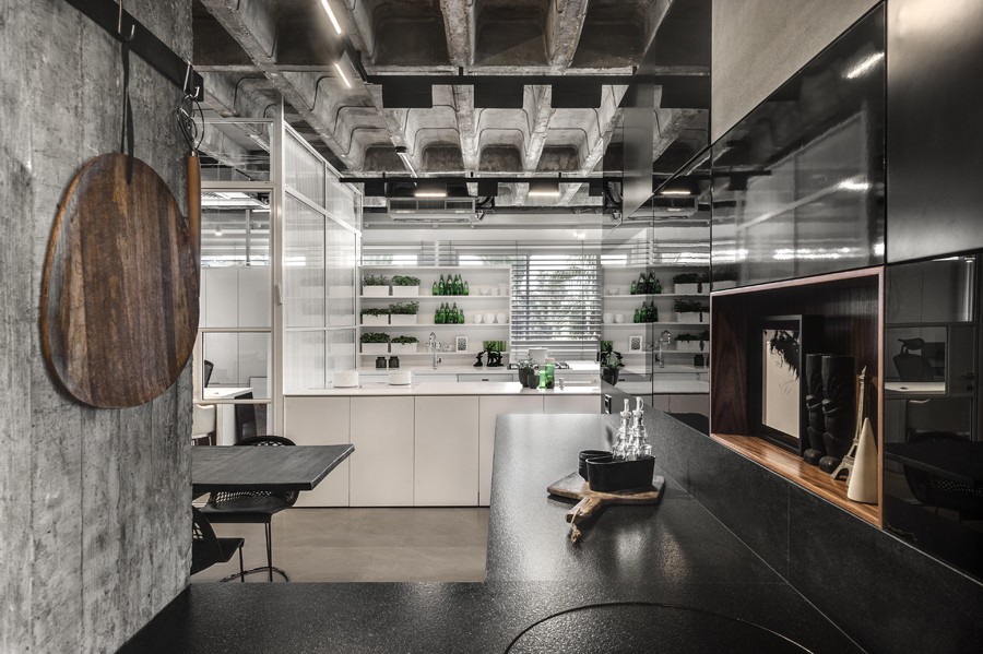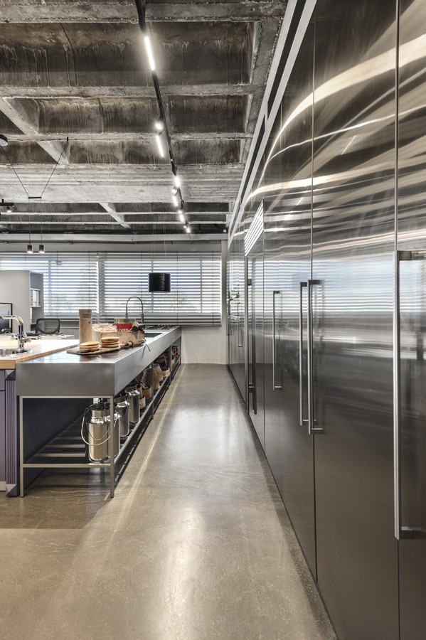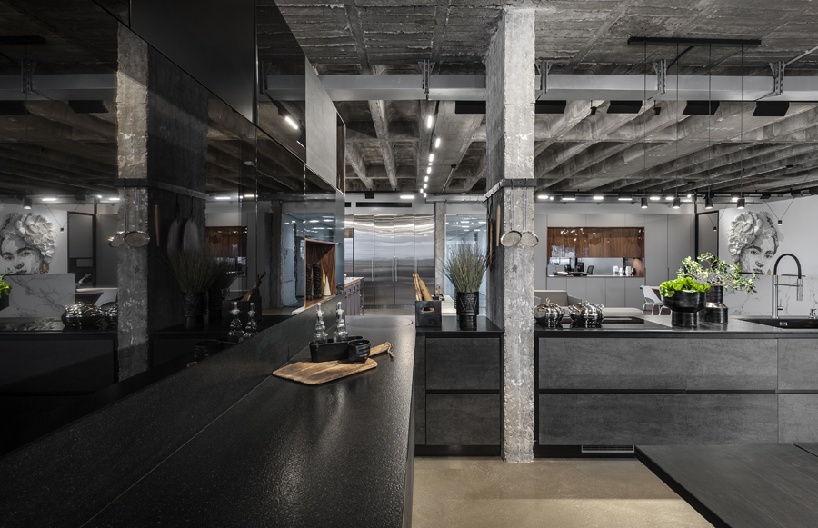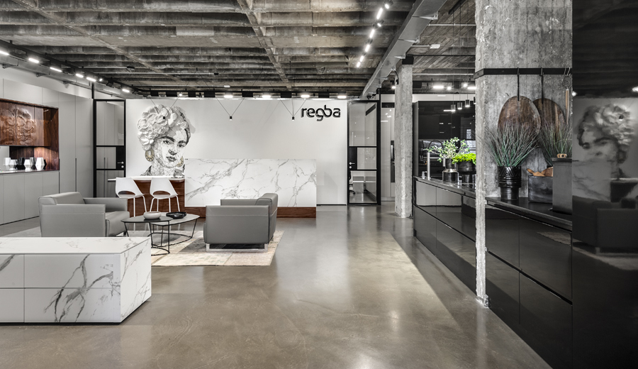 עיצוב הפנים של אולם התצוגה תוכנן בשפה ייחודית שתואמת את המעמד של המותג הוותיק והמבוסס. תקרת הבטון הקיימת הפכה לאלמנט מרכזי, שהציבה אתגר אך גם סיפקה במה אדריכלית דרמטית ובלתי מתפשרת. הפרויקט כלל פיתוח פריטי נגרות ייחודיים בשיתוף עם חברת רגבה, במטרה לייצר חווית תצוגה מבודלת בעולם המטבחים. שילוב מדויק בין אמנות ישראלית למשטחים ומוצרי חשמל של מותגים מובילים, יצר מרחב עשיר, מדויק ורב־שכבתי.